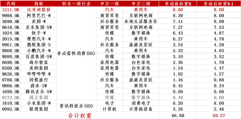我们在本文开头提到,恒生指数公司最近公布了季检结果,恒生科技指数此次调整纳入比亚迪股份,纳入权重为8%,剔除阅文集团,成分股维持在30只不变。调整结果将于6月9日(星期一)正式生效。