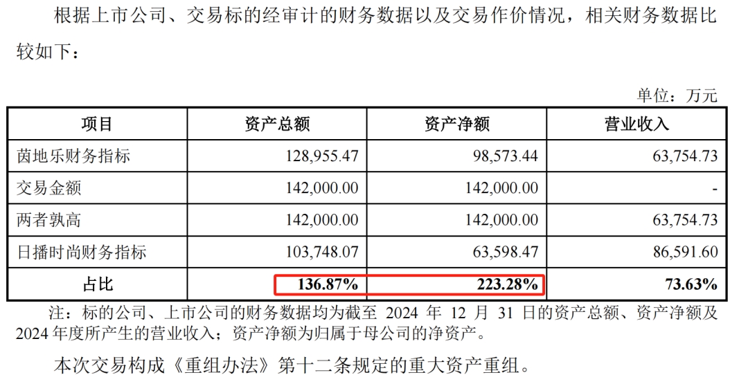 从重组指标来看,资产总额、资产净额指标均超过了100%。虽然梁丰获得日播时尚控制权不足36个月,梁丰也控制茵地乐29%的股权,为了规避重组上市,本次交易对手方并不涉及到梁丰及其关联人,所以本次交易不构成重组上市。
