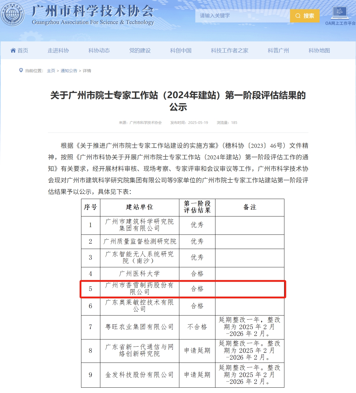 根据《关于推进广州市院士专家工作站建设的实施方案》(穗科协〔2023〕46号)文件精神,按照《广州市科协关于开展广州市院士专家工作站(2024年建站)第一阶段评估工作的通知》有关要求,香雪制药顺利通过第一阶段院士专家工作站评估。