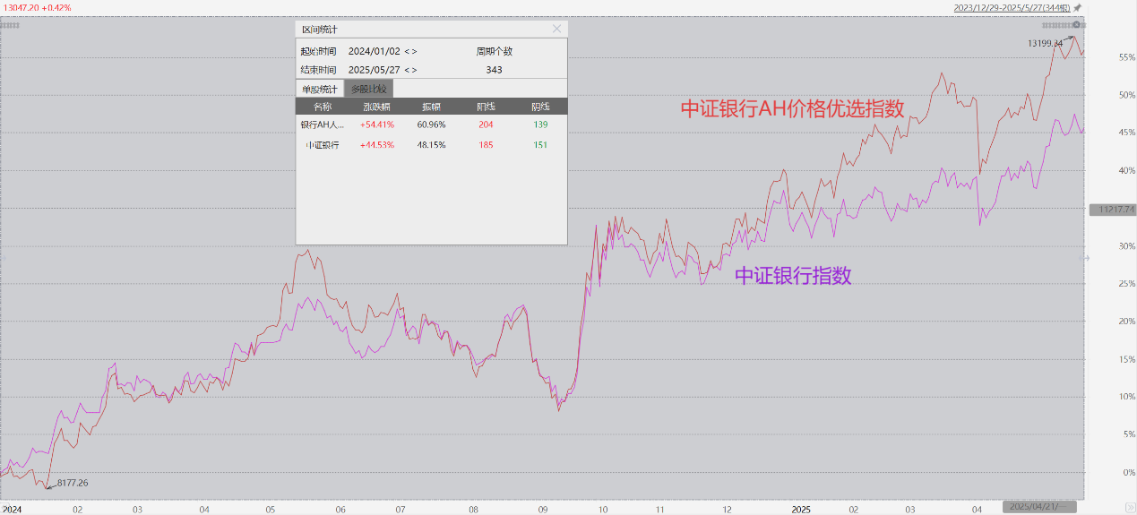 稳健端可以考虑价值风格或红利策略,也可以考虑兼具低估值和高股息特征的银行指数基金,比如中证银行AH价格优选指数,每月评估A股与港股银行股的估值差异,优先配置估值更低、股息率更高的成份股。从与中证银行指数的叠加图可以看出,2024年以来中证银行AH价格优选指数超额收益明显,并且波动率更低。