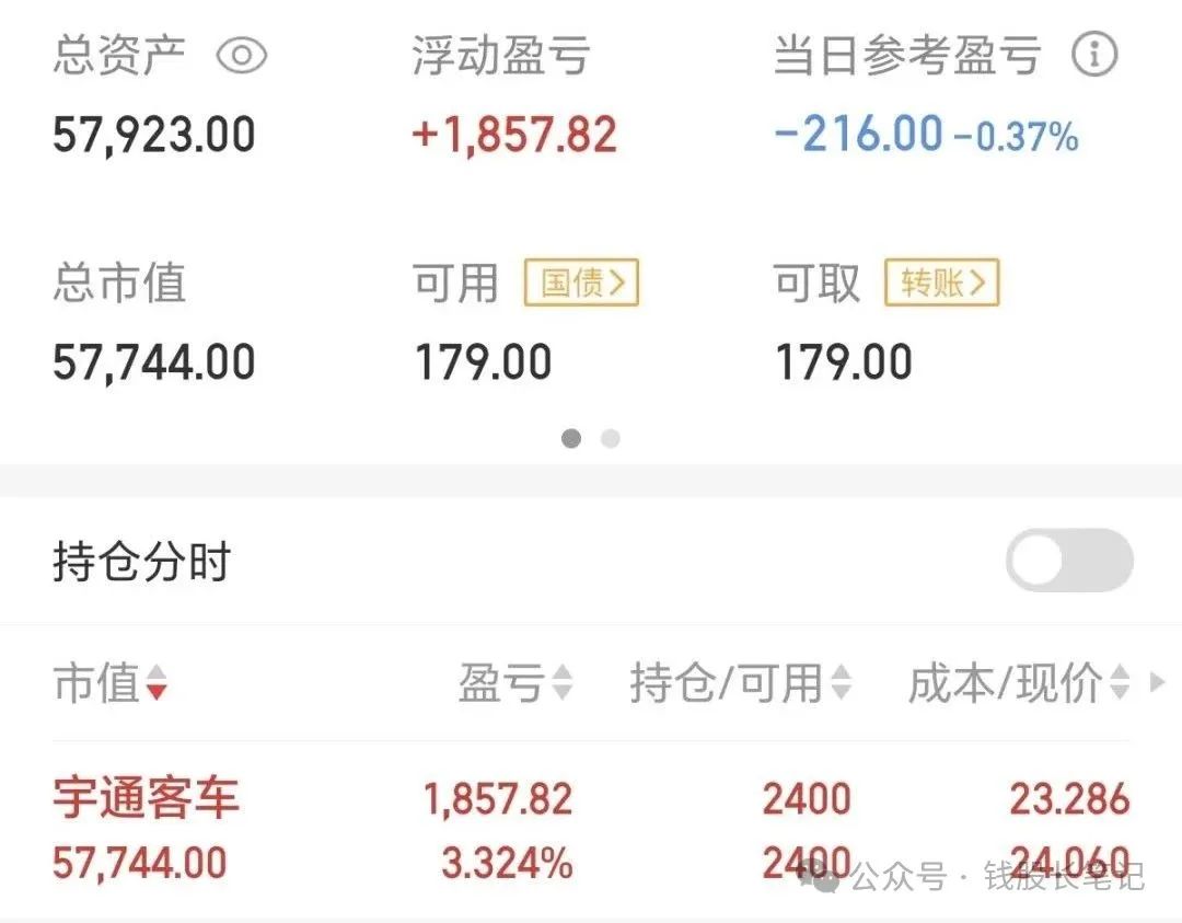 (2025年1月10日小账户持仓宇通客车2200股,成本价25.746元每股;今天持仓宇通客车2400股,成本价23.286元每股;本小账户仅为验证高息做T策略的可行性,切勿跟随买卖,高息做T策略思路可参看文章《一个高股息做T策略》.