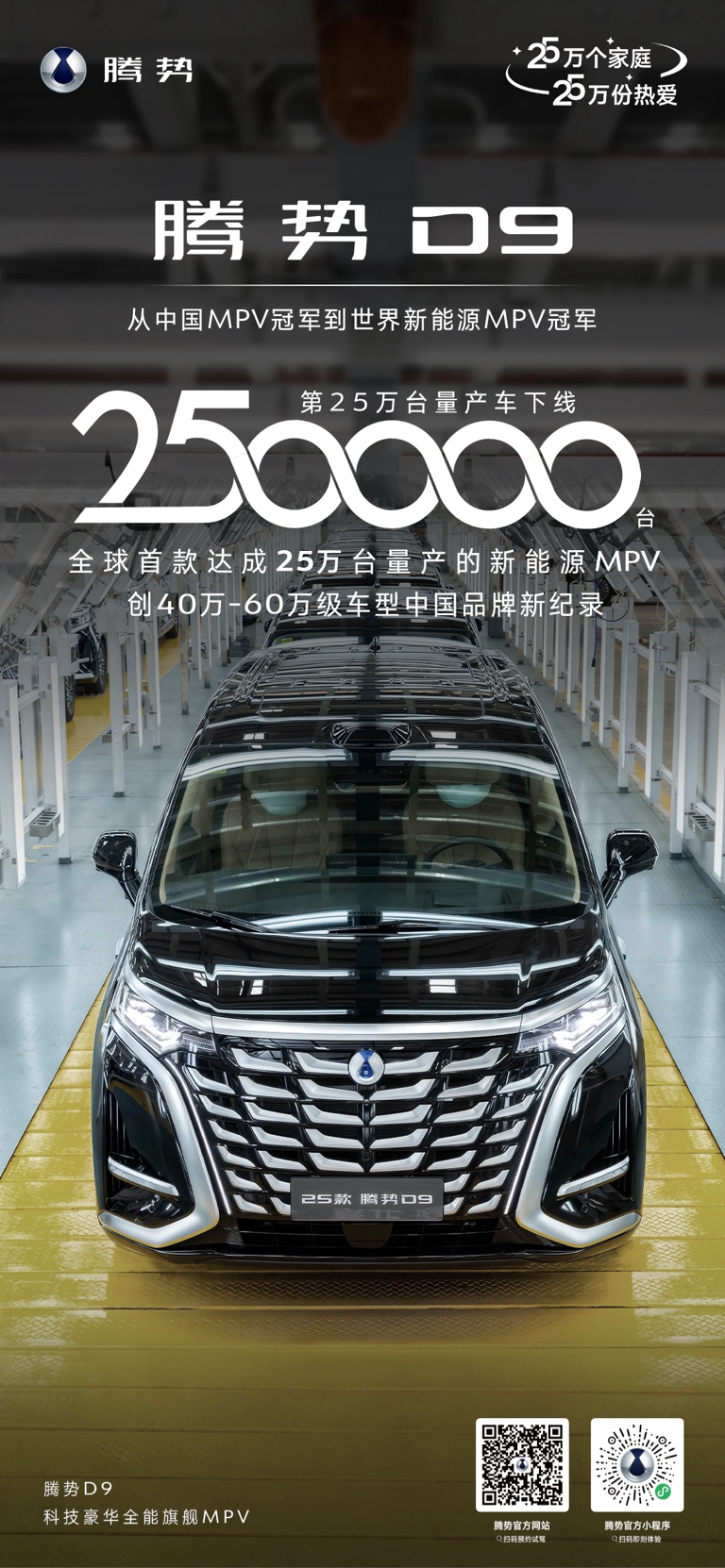 $比亚迪(SZ002594)$ 近日,比亚迪长沙工厂迎来里程碑时刻——腾势D9第25万台量产车正式下线。从中国MPV冠军到世界新能源MPV冠军,腾势D9用不到三年时间完成了一次了不起的跨越,成为全球首款达成25万台量产的新能源MPV,凭匠心工艺重塑豪华标准,也成功开创了豪华MPV新时代。