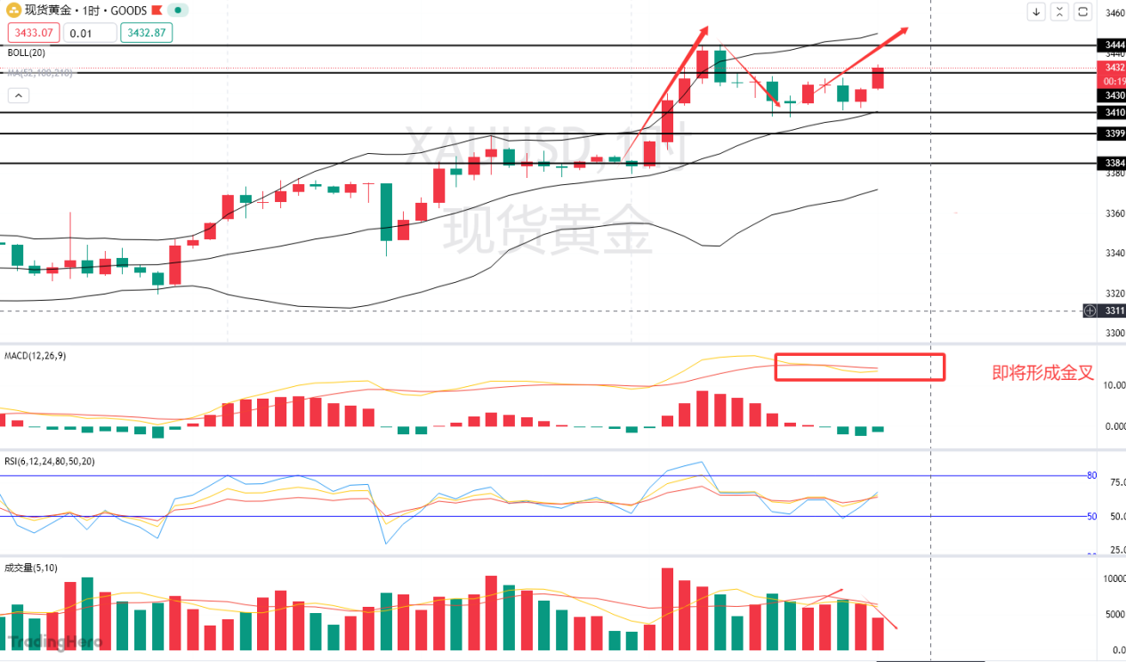 基本面双重大支撑,黄金走单边上涨行情的概率很大,前面的早盘视频就跟大家说过了,黄金极有可能上拉至3430,目前已经到达目标位,这波关注一下上方3440的压制,若是没有压制成功,直接上车,看到3500。