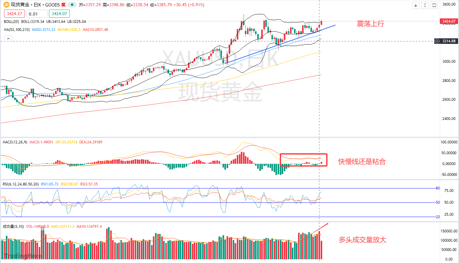 成交量,多头成交量处于放量增长阶段,意味着前期的回调彻底结束,开始重回牛市,极有可能形成日线级别的红三兵形态。
