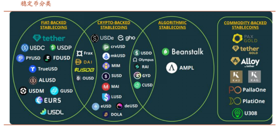 以锚定标的类型划分,稳定币包括法币抵押型、加密货币抵押型、算法稳定币、商品抵押型等形式。1)法币抵押型:由美元等法币作为储备支撑,每一枚稳定币都有对应的美元资产存放在银行账户中;2)加密货币抵押型:由比特币等加密资产作为抵押品,并通过智能合约自动调整供应量以维持稳定性;3)算法稳定币:不依赖任何抵押资产,而是通过算法调控供应,来使价格稳定在目标水平;4)商品抵押型:由贵金属、石油等商品作为储备支撑的稳定币。