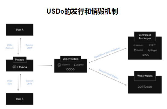 USDe由Ethena发行,是基于stETH和衍生品对冲的合成美元稳定币。USDe通过一系列的加密衍生品组合,实现与美元进行稳定的挂钩,自问世以来保持着较快的发展速度,其最高规模超过60亿美元。白名单客户可以提供BTC、ETH、SOL以及其他稳定币等给Ethena,Ethena会发行等值的USDe(扣除滑点和执行费用),然后该协议会在交易所做空等值的永续合约。举例来说,假如白名单客户给Ethena1ETH发行等值的USDe,Ethena同时会去交易所做空1ETH,使得delta平衡。同时这些资产由场外服务提供商托管,以最大限度地降低交易对手风险。