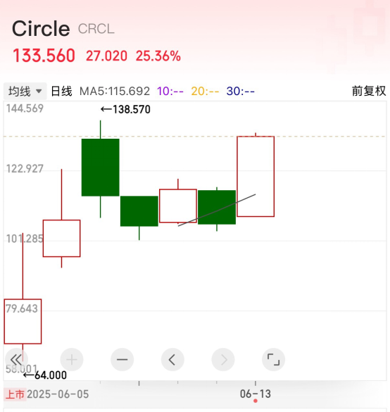 6月5日,Circle在美国纽约证券交易所正式挂牌上市,成为“稳定币第一股”。其发行价定在31美元/股,上市以来涨势凶猛,最新股价为133.56美元/股,涨幅超300%。