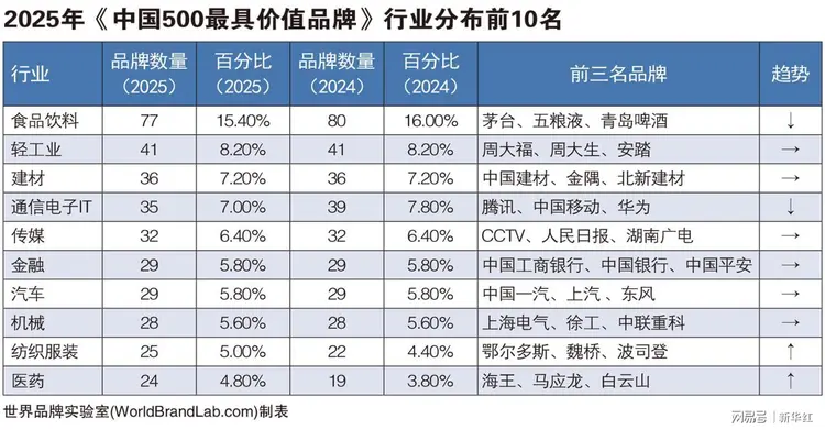 本年度《中国500最具价值品牌》排行榜中,共有来自食品饮料、轻工业、建材、通信电子IT、传媒、金融、汽车、机械等在内的24个相关行业的品牌入选。其中食品饮料业依然是入选品牌最多的行业,共有77个品牌入选,占总入选品牌数的15.40%;入选数量位居第二到第五的行业分别是轻工(41个)、建材(36个)、通信电子IT(35个)、传媒(32个)。在衡量品牌的忠诚度时,世界品牌实验室参考了我信品牌(iTrust Rating)的评级数据;在衡量品牌的领导力特别是ESG(环境、社会和治理)评分时,参考了超级财经(SuperFinance)的ESG数据库。同时还借用了低碳国际(Carboncare International)对品牌企业碳排放的计量,以推动品牌添加“碳排放评分”标签。