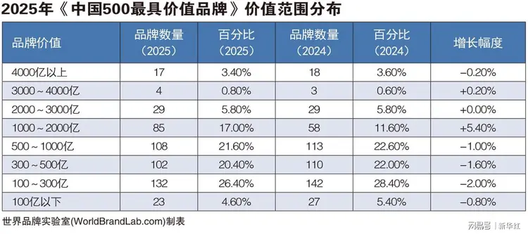 2025年《中国500最具价值品牌》的总价值为42.03万亿元,比去年增加3.46万亿元,增幅为8.97%,相比往年,增速明显放缓。世界品牌实验室学术委员会主席、牛津大学(Oxford)营销学荣誉教授斯蒂芬·沃格(Steve WOOLGAR) 博士表示:“在过去的20多年中,我目睹了中国品牌的快速成长,有的已经具有强大的世界影响力。”国家电网、海尔、华润、中化、中国南方电网、河钢、中国华电、五粮液、徐工、青岛啤酒、中国国航、通威、波司登、飞鹤、恒力、协鑫、九牧、双星轮胎、阳光电源等成为2025年度最佳表现品牌。