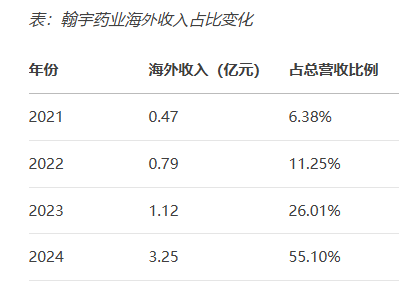“国际业务收入已成为公司主要来源”,财报中的这句话揭示了翰宇药业翻身的核心密码。从2021年海外收入占比仅6.38%,到2024年飙升至55.10%,翰宇只用了四年时间就完成了从本土药企到国际化企业的蜕变。