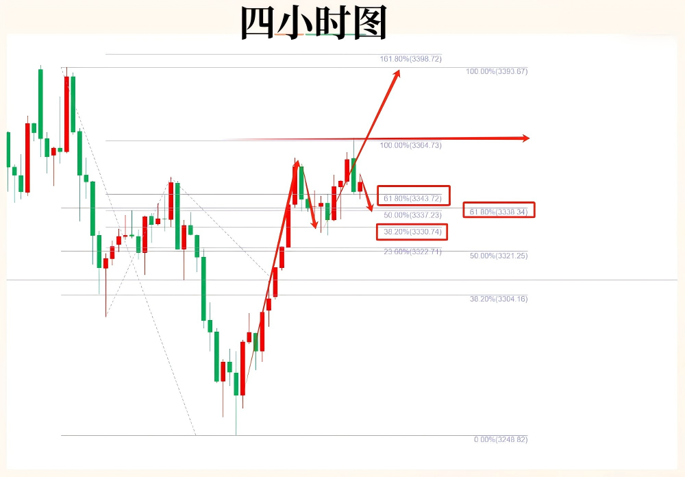 四小时图,在昨日ADP数据影响,黄金受支撑,重新站在了40上方,今天也是直线向上又去试探了斐波那契扩展线100%(3363),在这个位置受压之回调,试探61.8%(3343),那我们今天也就是看43的位置是否能支撑住,黄金还会面临继续向上去冲吗。若撑住黄金将继续延续拉涨向前高看齐,甚至这个前高也是日线级别的三重顶,强压点位。如果43支撑住的话,我们可以尝试接个多单,但是要注意好这个位置破位的话,它下方还有38这个位置也是前期的日线收线支撑位,若破位,黄金还会再向下去走,去踩昨日低点28附近,甚至形成一个拉高破位的状态,那我们就注意好,最关键还是看3338支撑柱,今日白天我们要注意好3363-3338这个区间,去走高空低多。做单带好止损,勿贪。