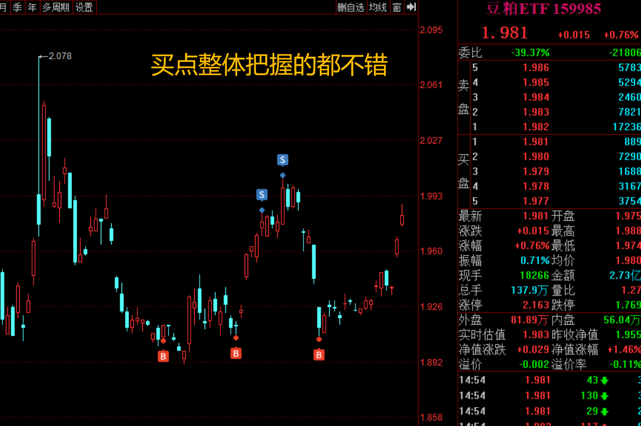 昨天把豆粕ETF减仓了一半,持有17个交易日,盈利大约3.6%,剩下的一半等高位滞涨再卖。豆粕ETF做了好几波了,每次都很稳健,低点把握的也好,做起来很省心,稍微耐心拿一拿,就能轻松赚一波。