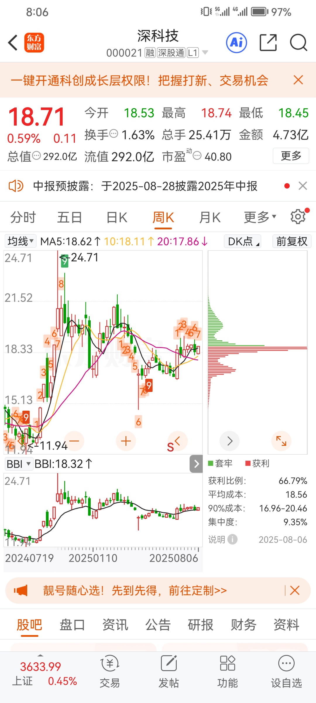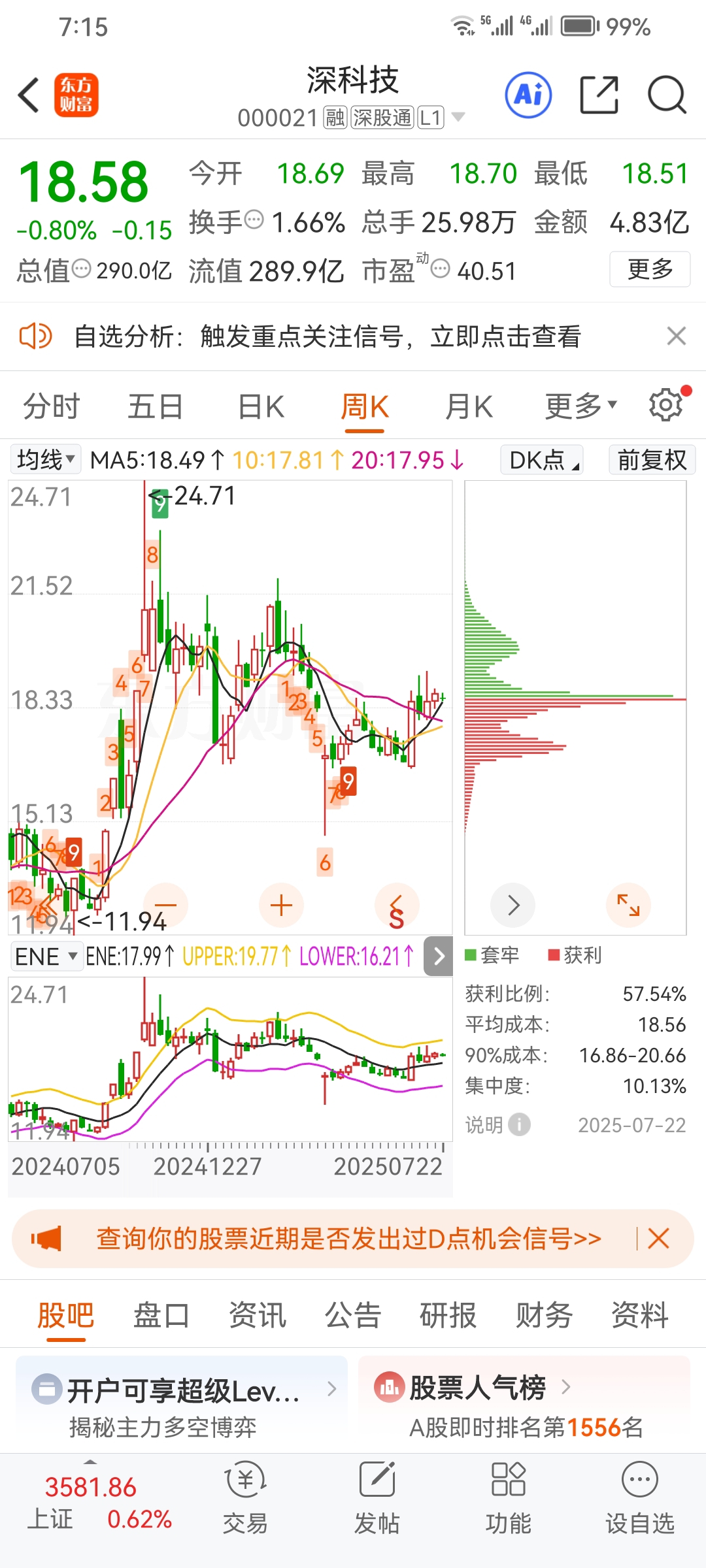 $深科技(SZ000021)$ 首先说明一下:二级市场上无论是质优股还是亏损股,也无论是大盘股还是小盘股都有主力在操作,只是主力的操盘爱好和手法不同,留下的日k线筹码峰和周k线筹码峰就有所不同。人们往往只看日K线的筹码峰来判断主力的动态,忽略了周k线筹码峰的作用。进入主题:个股周k线的筹码峰能反映中小散户、主力持股的时间以及持股的多少?长长尖尖的筹码峰往往是中长线主力缓缓吸筹形成(注意:日k线长长的筹码峰则是短线游资短时间内吸筹形成),短短椭圆型的筹码峰往往是跟风的中小散户的堆积筹码形成,中小散户的筹码会堆积在中长线主力筹码的下方和上方,这些筹码必须清理掉80%主力才能轻松拉升股价。就拿深科技这只股的周k线筹码峰为例让大家来见证学习(这里不可用文字表述,只能另处讲解)。最后说明一下:每个个股的股吧里总有一些人不懂主力的操作手法而乱叫,要么喊涨停,要么喊跌停,短线游资利用板块轮动到位拉升操作就微笑眼开、手无足道;中长线主力打压个股缓缓吸筹而不拉升就喊娘骂爹,喊娘骂爹的人往往是急性子,多数是套牢之人或是之前被个股损害过的人,唱多唱空都是有原因的,大家认为是么?欢迎评论区留言。