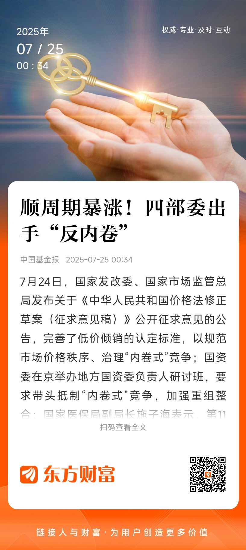 $ST合纵(SZ300477)$ $ST赛为(SZ300044)$ $ST股(BK0511)$ 当 “反内卷” 从互联网热词蜕变为国家层面的系统性行动,其对市场的重塑力量已远超想象。周四盘后,两部门与国资委的密集发声,将这场运动推向新高度 —— 完善低价倾销认定标准、规范市场价格秩序的组合拳,直指光伏、锂电、煤炭等过度竞争行业的痛点。更值得关注的是,这场运动已从实体产业蔓延至金融领域,形成 “万物皆可反内卷” 的格局。