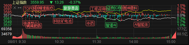 2025年8月1日,A股市场延续震荡格局,三大指数小幅收跌,但个股涨多跌少,市场情绪分化。截至收盘,上证指数报3559.95点,跌0.37%;深证成指报10991.32点,跌0.17%;创业板指报2322.63点,跌0.24%。科创50指数跌1.06%,报1036.77点。全天成交额15983.51亿元,较前一交易日缩量3377亿元,显示市场交投热度略有降温,但整体仍维持较高水平,资金博弈持续。