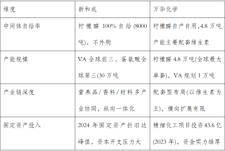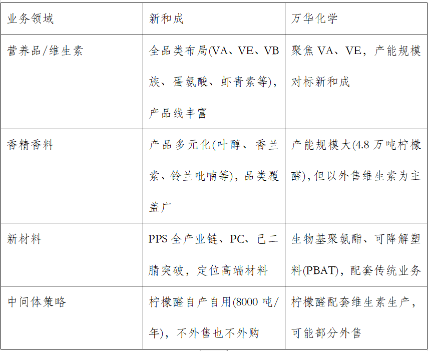 短期内,万华化学4.8万吨柠檬醛及1万吨维生素A产能投产主要冲击维生素市场,加剧行业价格竞争。但在香精香料领域,新和成的产品丰富度和客户基础构成护城河,地位难以撼动。中长期看,两家公司将走向差异化竞争:新和成向高端生物技术和高分子材料(如PPS、己二腈)升级;万华化学则依托平台优势拓展香料衍生品和绿色化学业务。