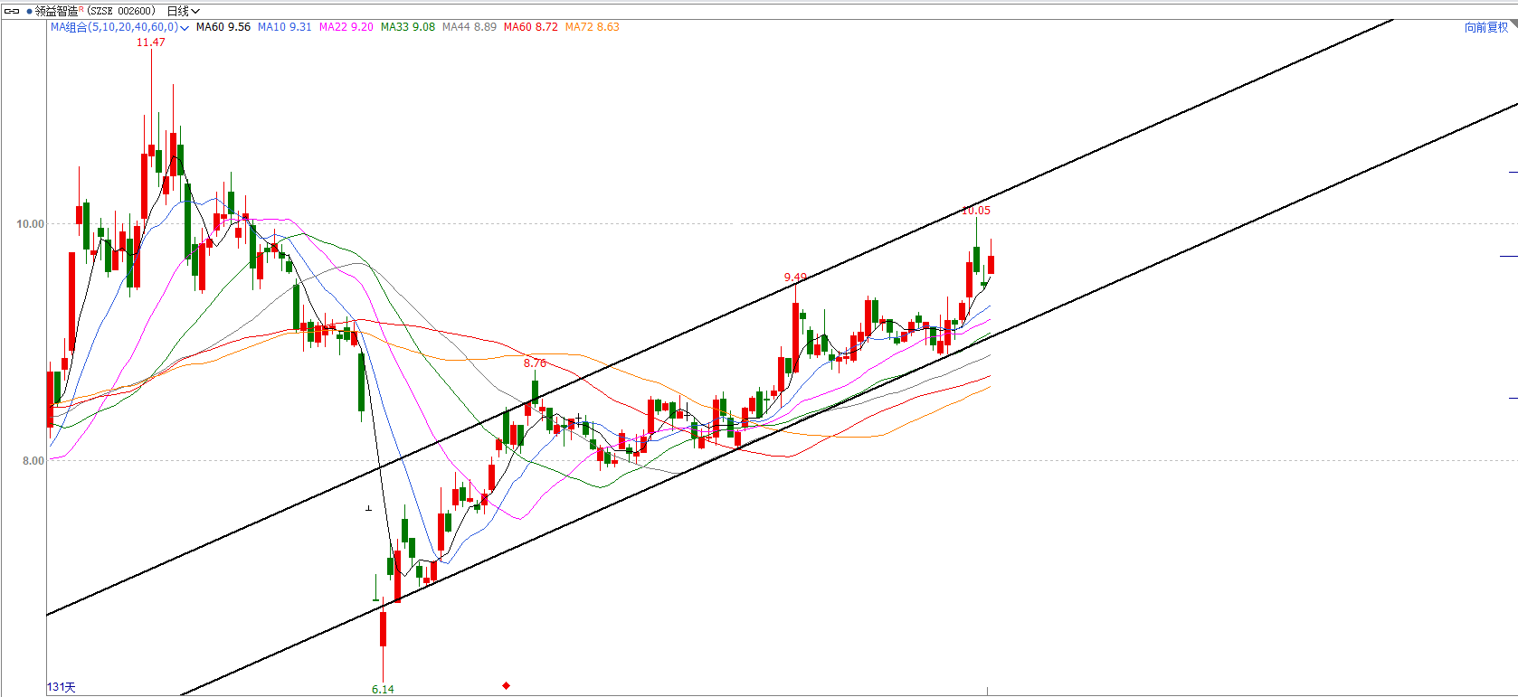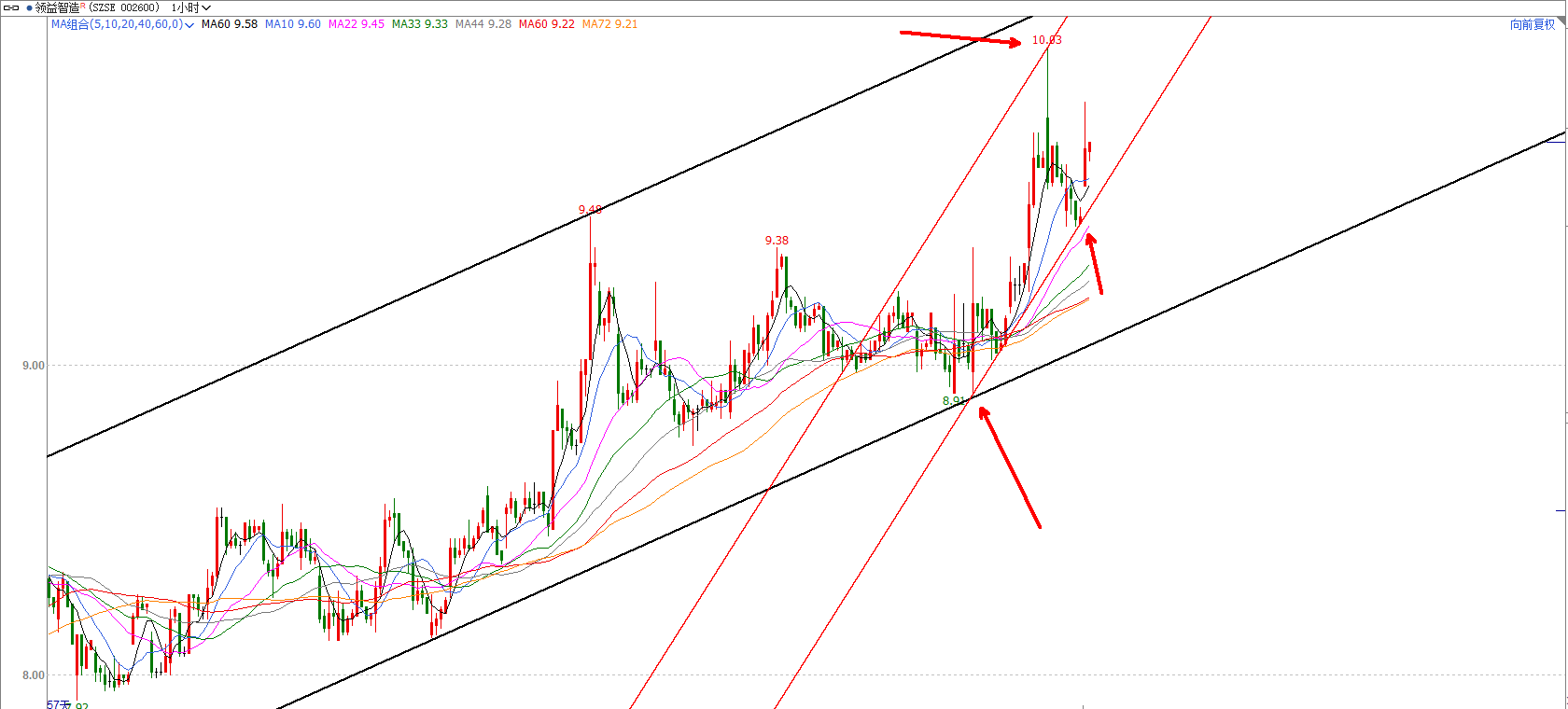 首先复制在日线下的黑色跟踪阻支区间。并根据在60分钟下顶底波动情况设立红色阻支区间。红色阻支区间目的用于跟踪投资标的价格突破黑色阻支区间之后的波动情况。