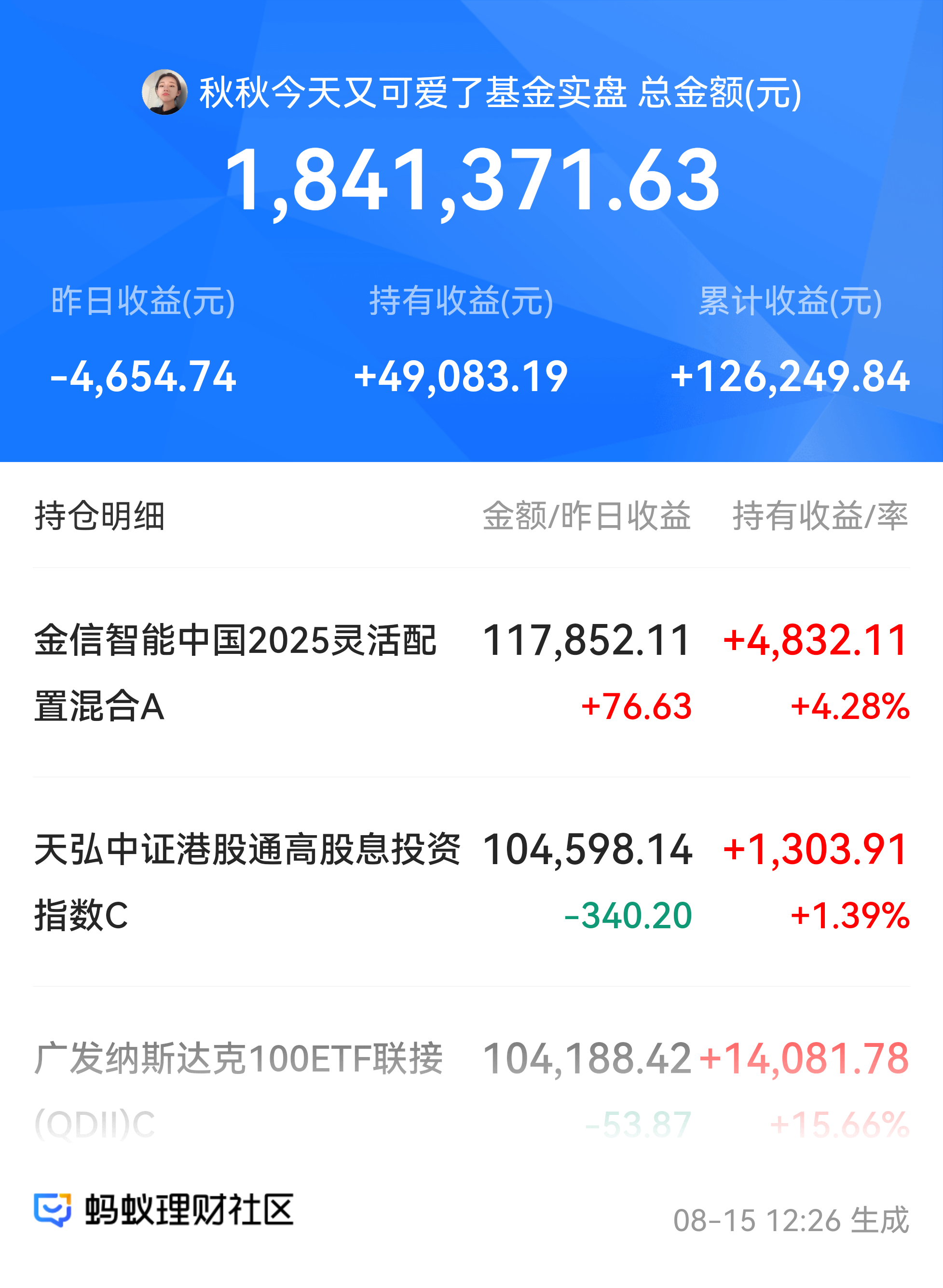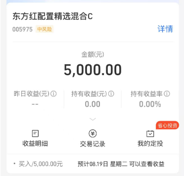 在这种行情趋势下,我配置了东方红配置精选混合A,它是一只配置了A股、港股、信用债的固收+基金,在目前A股和港股两个市场行情不断修复的情况下,基金业绩也不断向好,基金近一个月收蛋209个,近半年收益为4.18%,一年收益13.31%,从我买入到现在,这只基金收益一直在不断攀新高,我预期随着9月降息后,基金业绩会进一步向好,所以我会持续布局,今天上车5000