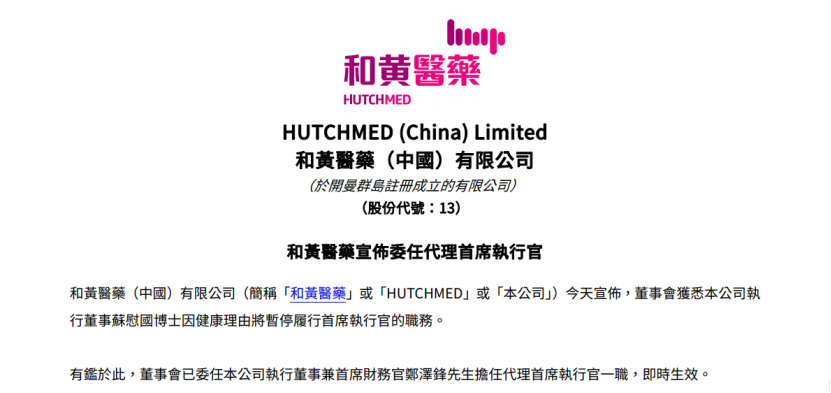 今日(8月25日),和黄医药$和黄医药(HK|00013)$发布公告,公司执行董事苏慰国博士因健康理由将暂停履行首席执行官的职务。董事会已委任公司执行董事兼首席财务官郑泽锋先生在担任首席财务官外,同时担任代理首席执行官一职,即时生效。