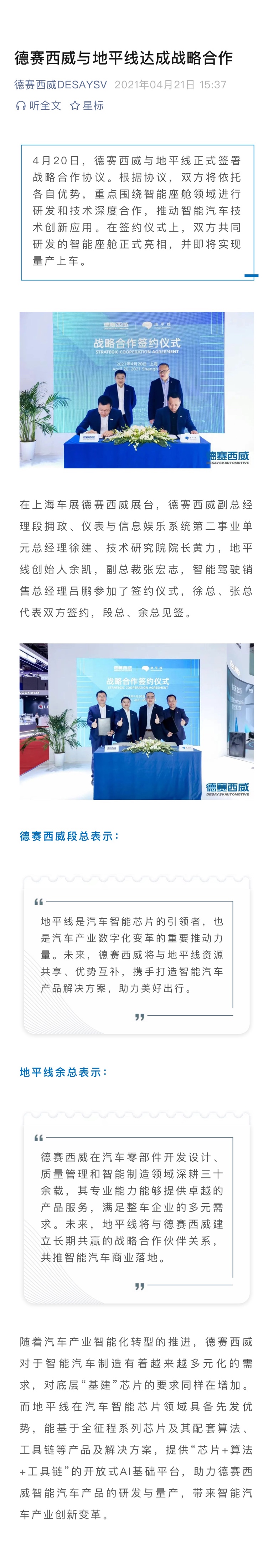 地平线是汽车智能芯片的引领者,也是汽车产业数字化变革的重要推动力量。未来,德赛西威将与地平线资源共享、优势互补,携手打造智能汽车产品解决方案,助力美好出行。