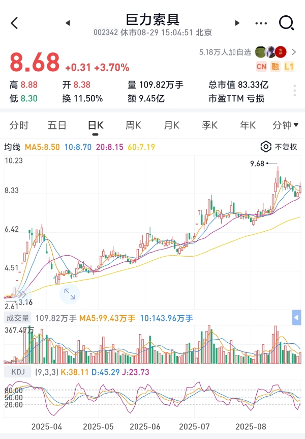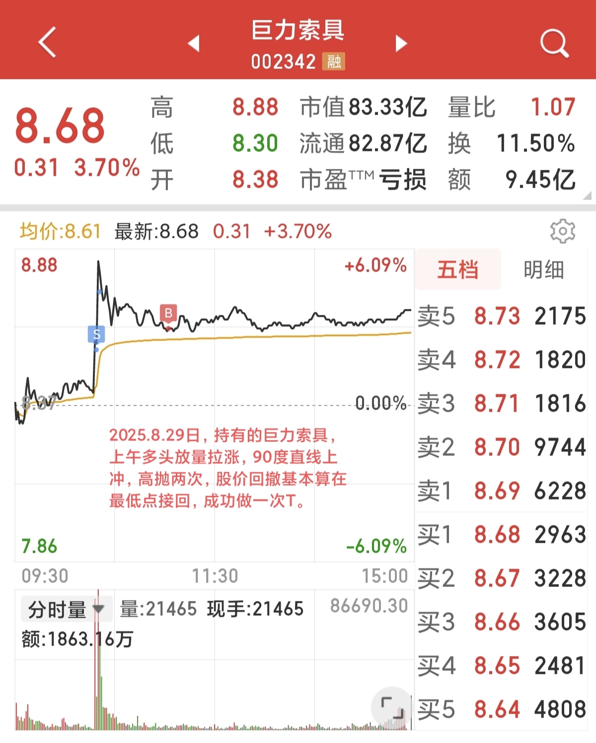 2025.8.29日,持有的巨力索具,上午多头放量拉涨,90度直线上冲,高抛两次,股价回撤基本算在最低点接回,成功做一次T。![微笑 [微笑]](http://gbfek.dfcfw.com/face/emot_default_28x28/emot1.png)