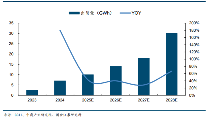 目前固态电池正处于测试阶段因而出货量较少,远期有望凭借性能优势成为下一代电池技术的主流。根据GGII和中商产业研究院数据显示,2024年中国固态电池出货量约7GWh,考虑到技术优化普及需要的时间,预计2027年将是固态电池产业从市场发展初期迈向快速上升期的转折点,根据预测2027年中国固态电池出货量将达到18GWh,2028年达到30GWh,2024-2028年期间复合增速为44%。
