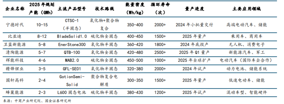电池企业对固态电池的重视度显著提升,纷纷开始进行产能布局。随着全球电动汽车市场的迅猛发展,对高性能电池的需求日益迫切,固态电池作为下一代电池技术的有力竞争者,也成为科研界与产业界共同关注的焦点。具体来看,卫蓝新能源、清陶能源、赣锋锂电、辉能科技等专注于固态电池的国内初创企业率先实现了半固态电池的量产。宁德时代、比亚迪、国轩高科等国内主流电池厂商也开始聚焦于全固态电池。从电池企业的产能规划来看,头部企业(宁德时代、比亚迪)2025年规划产能在8GW以上,面向高端车用市场;第二梯队(卫蓝、清陶)聚焦细分领域,2025年规划产能在5GW以上,适配消费电子及特种场景;第三梯队的企业2025年规划产能基本也在2GW以上。