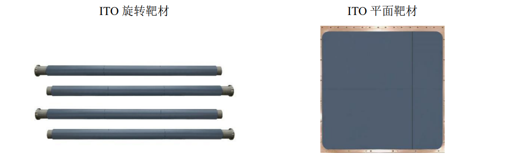 ITO 靶材,即氧化铟锡(Indium Tin Oxide)靶材,是溅射靶材中陶瓷化合物靶材的一种。ITO 靶材是将氧化铟和氧化锡粉末按一定比例混合后经过一系列的生产工艺加工成型,再高温气氛烧结形成的黑灰色陶瓷半导体材料。ITO 靶材主要用于制备显示面板的像素电极层和公共电极层,触控屏的透明导电层与电极以及 HJT 电池的透明导电膜,具备透光率高、导电性能好、刻蚀性能佳等优势。 公司的 ITO 靶材主要应用于半导体显示面板、触控屏、太阳能电池等领域。可分为旋转靶与平面靶。