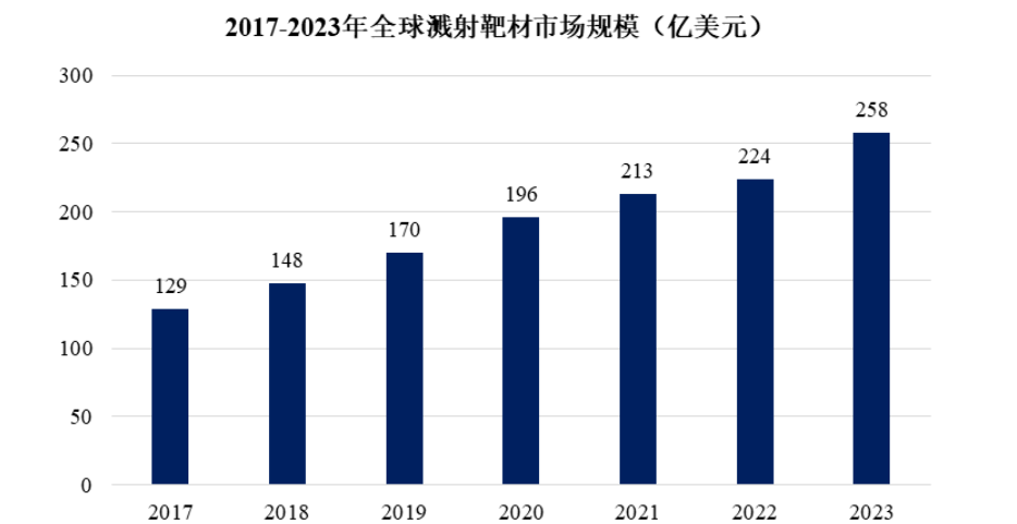 据前瞻产业研究院统计及预测,2017-2023 年,全球溅射靶材市场规模从 129 亿美元上升至 258 亿美元,年复合增速为 12.25%。随着平面显示、集成电路半导体、太阳能电池、记录媒体以及节能玻璃等新型基础设施和新型应用领域的发展,溅射靶材的终端应用领域将进一步扩大,全球溅射靶材市场规模仍将持续稳定增长。