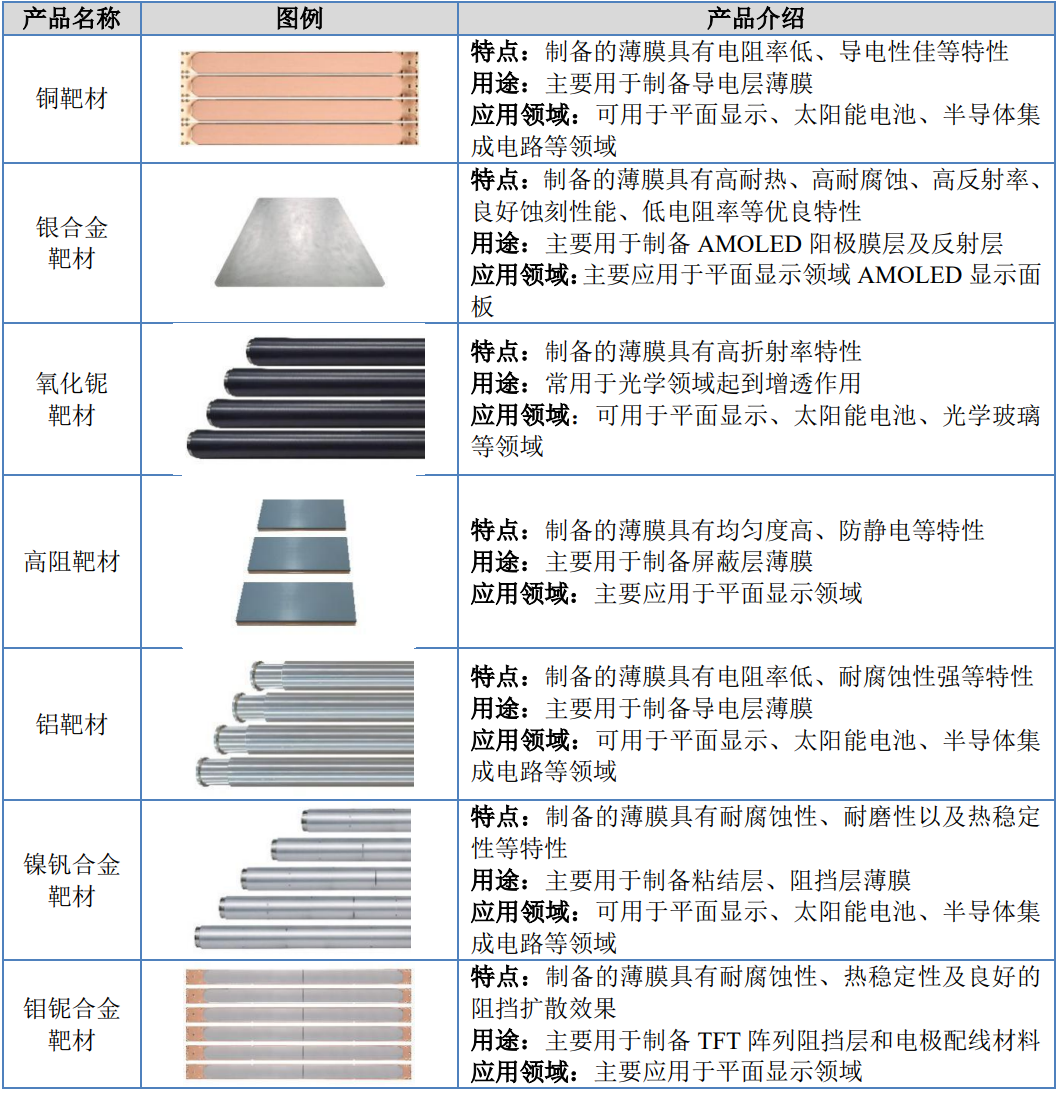公司是一家专业从事高性能溅射靶材研发、生产及销售的高新技术企业,主打产品为 ITO 靶材。此外还有高迁移率氧化铟基靶材、钼靶材、硅靶材、公司销售金额较大,且具有一定代表性的靶材产品还 包括铜靶材、铝靶材、氧化铌靶材、镍钒靶材、钼铌合金靶材等。