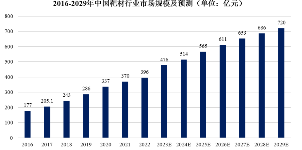 2016 年至 2023 年,中国高性能溅射靶材市场规模由 177 亿元增长至 476 亿元,年复合增长率为 15.18%。未来,受益于全球产业链转移,国内平面显示、太阳能电池、半导体集成电路等产业的快速发展,下游应用市场对高性能溅射靶材需求量将不断增加,高性能溅射靶材市场空间逐渐扩大,中国高性能溅射靶材行业市场规模在 2029 年有望达到 720 亿元。