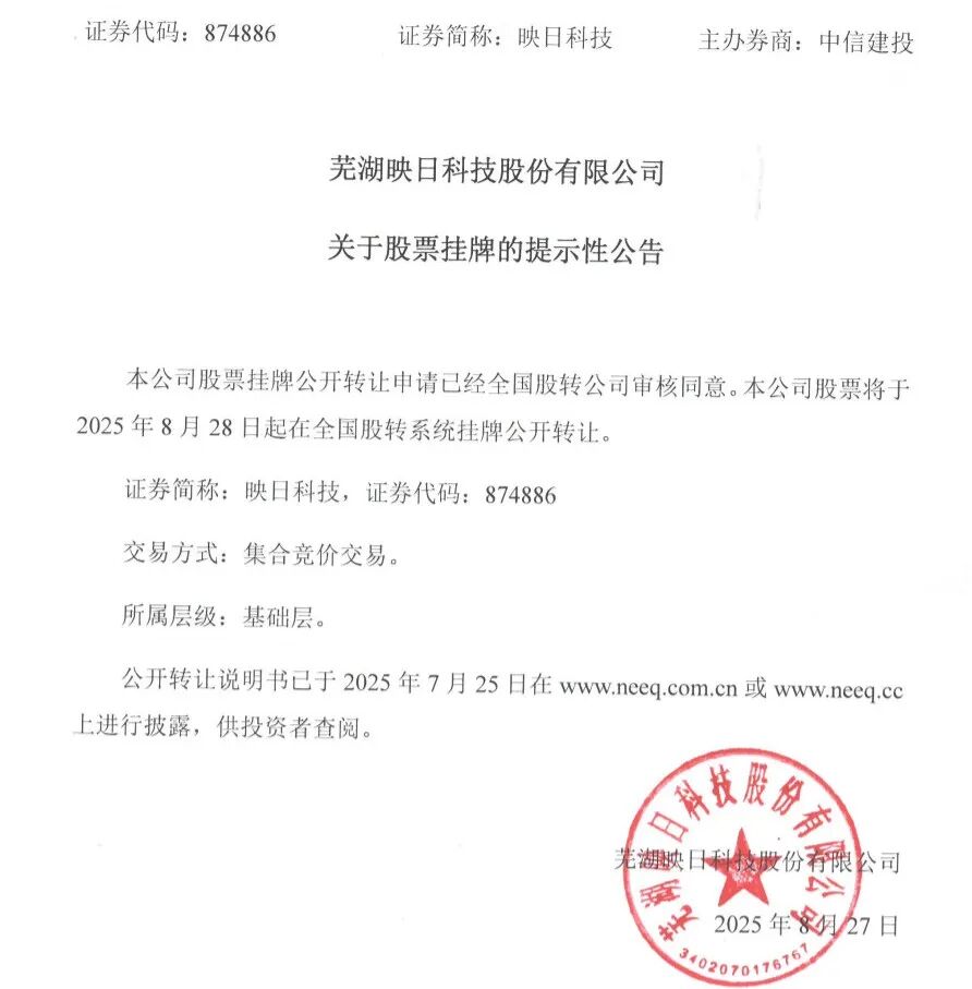 2025年8月28日,芜湖映日科技$映日科技(SZ874886)$挂牌新三板基础层,股票代码为874886