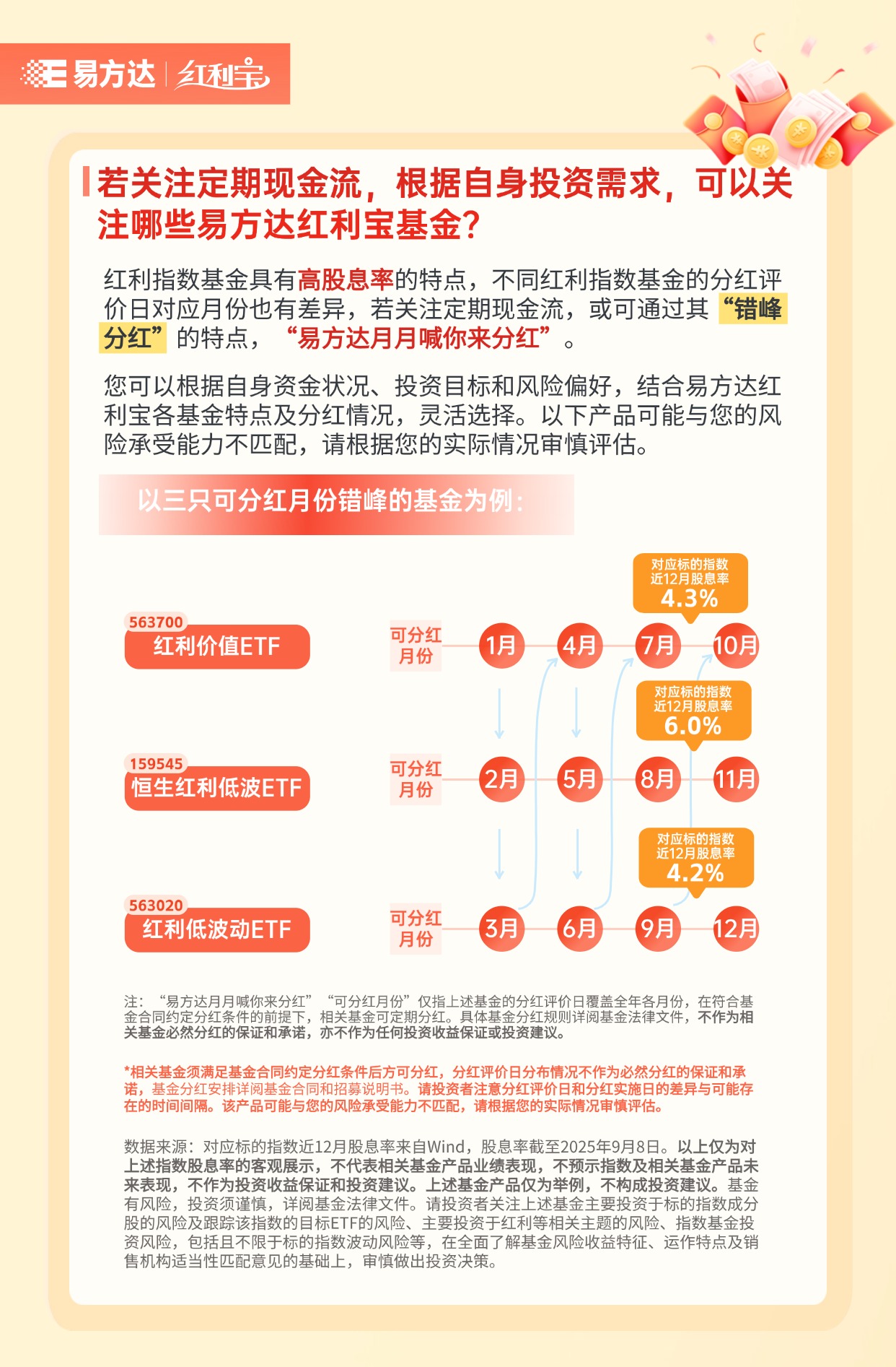 上述基金合同约定分红评价日分别为:易方达恒生港股通高股息低波动ETF为每年一月、四月、七月、十月最后一个交易日;易方达中证红利低波动ETF为每年二月、五月、八月、十一月最后一个交易日;易方达中证红利价值ETF为每年三月、六月、九月、十二月最后一个工作日。上述基金在各评价日分别对基金相对标的指数/业绩比较基准的超额收益率以及基金的可供分配利润进行评价。评价日核定的基金累计报酬率超过标的指数/业绩比较基准同期累计报酬率或者每10份基金份额可供分配利润金额高于相应目标金额时,基金管理人可进行收益分配,请投资者注意分红评价日和分红实施日(如有)的差异与时间间隔,基金收益分配规则设置不预示本基金未来表现,不作为投资收益或必然分红的保证,亦不作为投资建议,详阅基金法律文件。