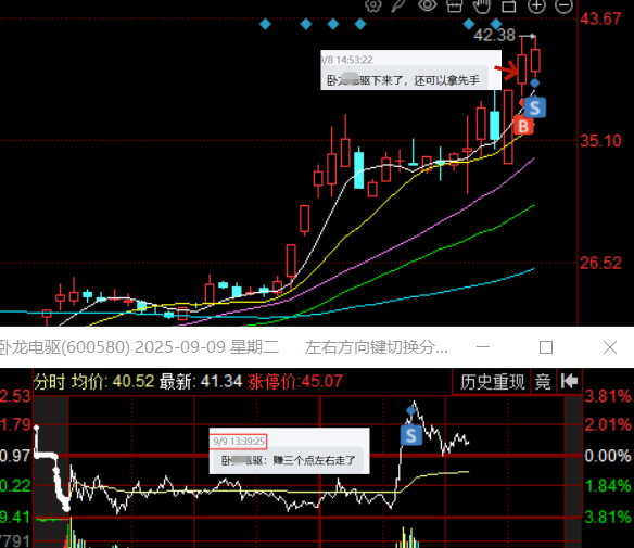 就在昨天(9月9日)尾盘操作了两只票,一只是:华通线缆(昨天尾盘低吸,今早拉升5个点以上分批止盈走了,单日获利5%+,交易记录详看上一条发文),另一只就是:卧龙电驱。逻辑都很明确:符合“金三角战法”中尾盘战法的模型,所以就低吸上车了。