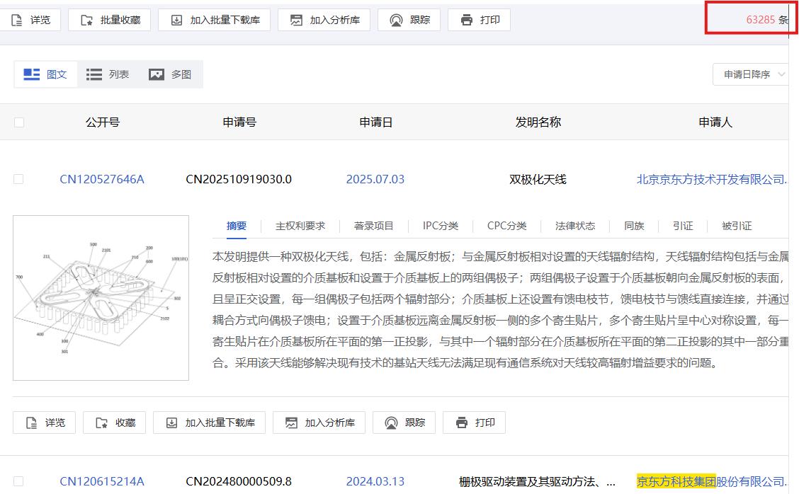 查询中国知识产权局专利,京东方科技集团的专利数量是63285,超过6w项。