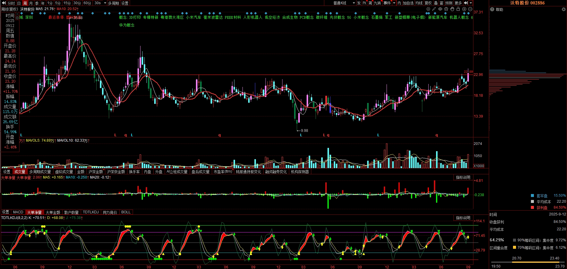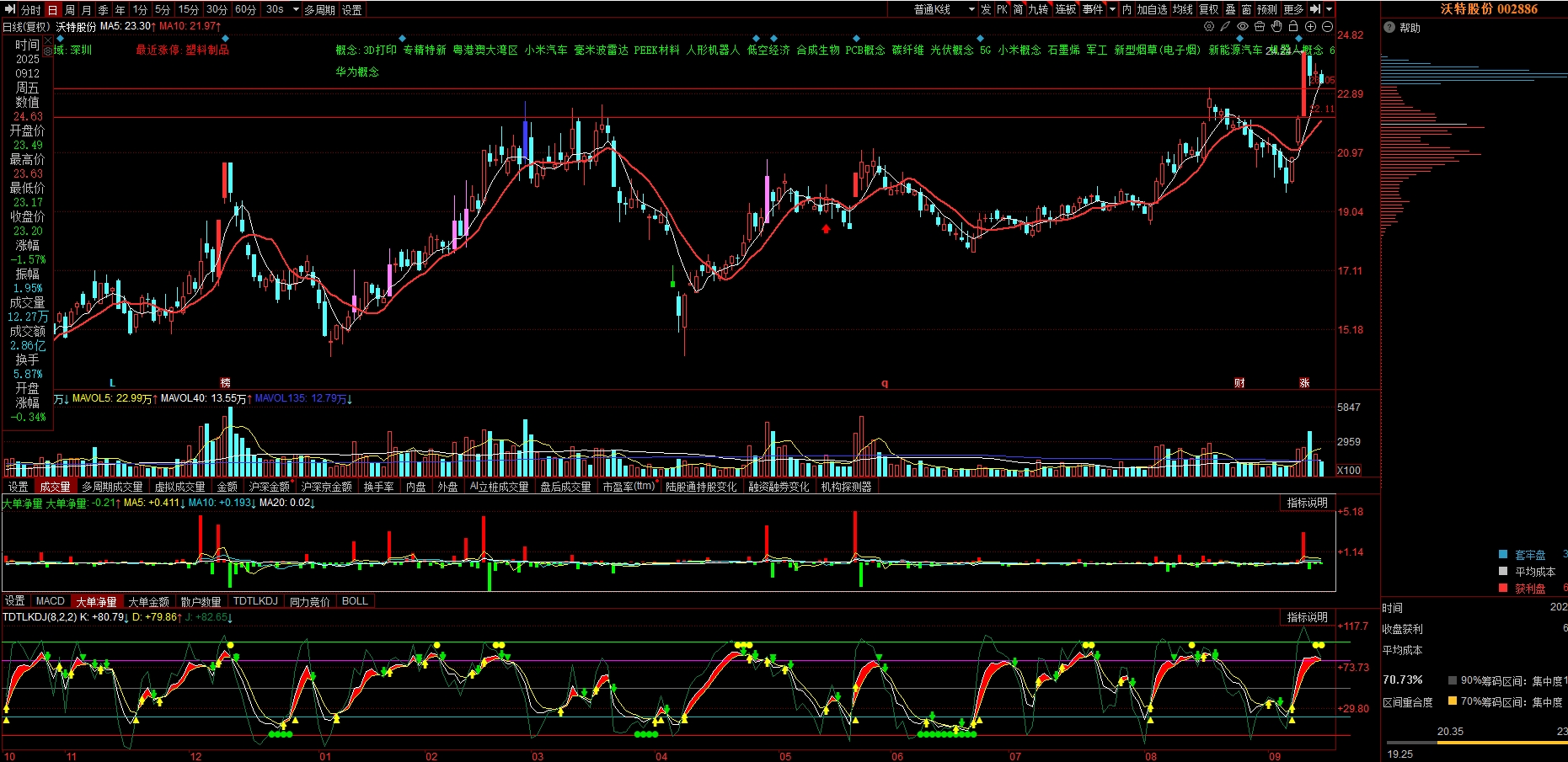 结论:小量就能成功突破,几天也没跌回去,有题材有消息刺激,等待调整结束可以积极关注。而且指标在高位,再次往上容易钝化。先观察23.05和22.11两个关键点位。
