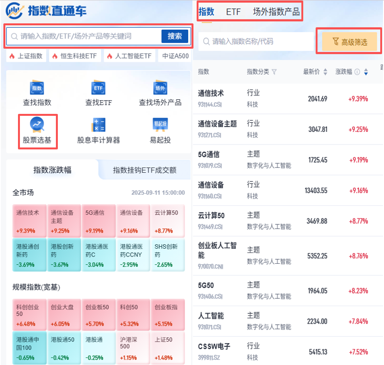 (1)直接在首页的搜索栏查找;(2)在“查找”界面通过指数、ETF、场外指数产品,以及高级筛选功能查找;(3)在首页“股票选基”上查看包含一只或者多只个股的指数产品。