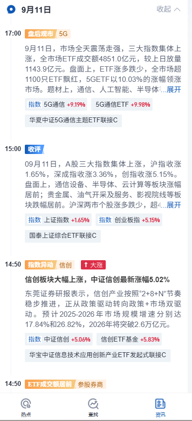 但是,我个人比较喜欢易方达对于这个板块的布局和内容输出。因为在这个小程序上,我看到了很多不同的重点资讯:盘后观市、收评、指数异动、ETF成交额居前、涨幅居前、折溢价风险提醒、定时播报、大事件解读等等~~