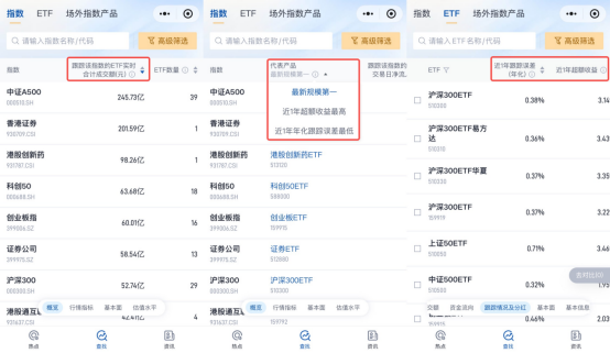 比如,“跟踪该指数的ETF实时合计成交额”让我清楚知道了成交活跃程度如何;比如,“代表产品--最新规模第一”让我能直观看到每一个指数中哪只产品的规模是最大的;再比如,“近一年跟踪误差”让我知道哪些ETF在过去一年与标的指数偏离度是最小的。