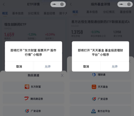 我看了一下,这个小程序的购买渠道很多,券商、互联网平台、基金公司等等都可以跳转,甚至场内ETF和场外指数基金都支持,在我印象里是目前唯一一个能做到的指数投资小程序。