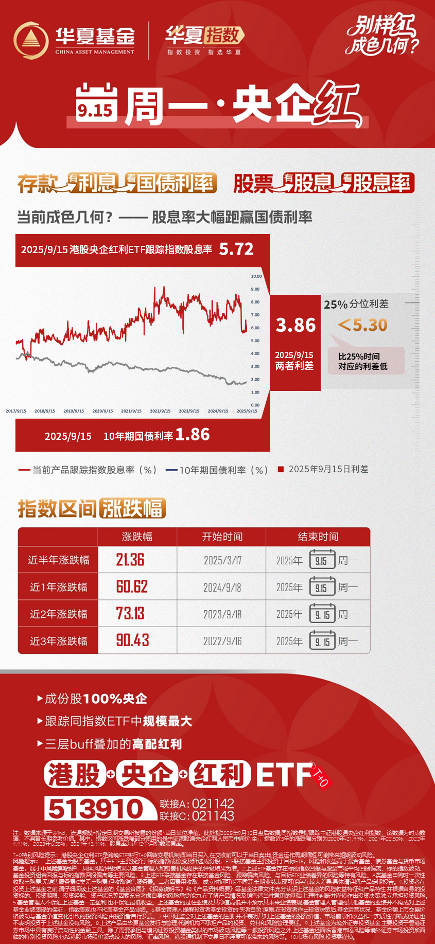 截至今日(9月15日) 港股央企红利ETF跟踪指数股息率5.72%;同日,10年期国债利率 1.86%;两者利差3.86%(上周一9月8日是4.04%)周度环比下降。