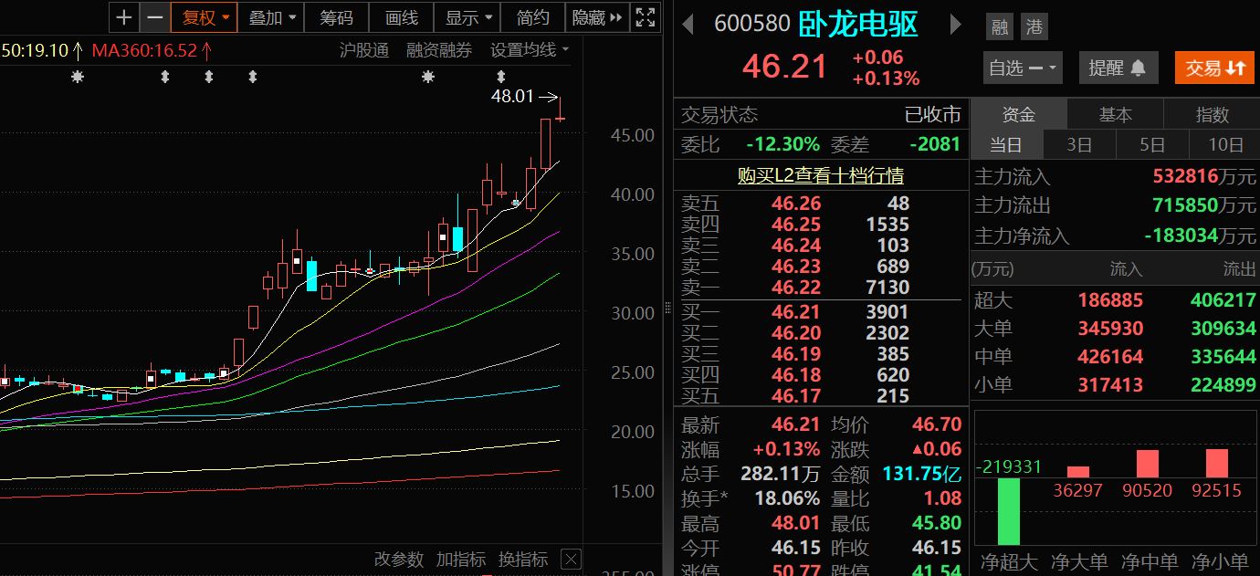 先说说卧龙电驱,今天震荡我觉得主要是短期大涨后的正常走势,从日K上看今天创出48块的历史新高,里面有不少浮盈资金,而今天主力资金净流出18亿元,更多是落袋为安。基本面上卧龙电驱上半年5.37亿净利润,同比+36.76%,增长还是比较快的,加上持股宇树科技,后续有望受益宇树IPO。短期等一波利润盘消化后,我认为后续仍有空间,等一波低吸的介入机会。