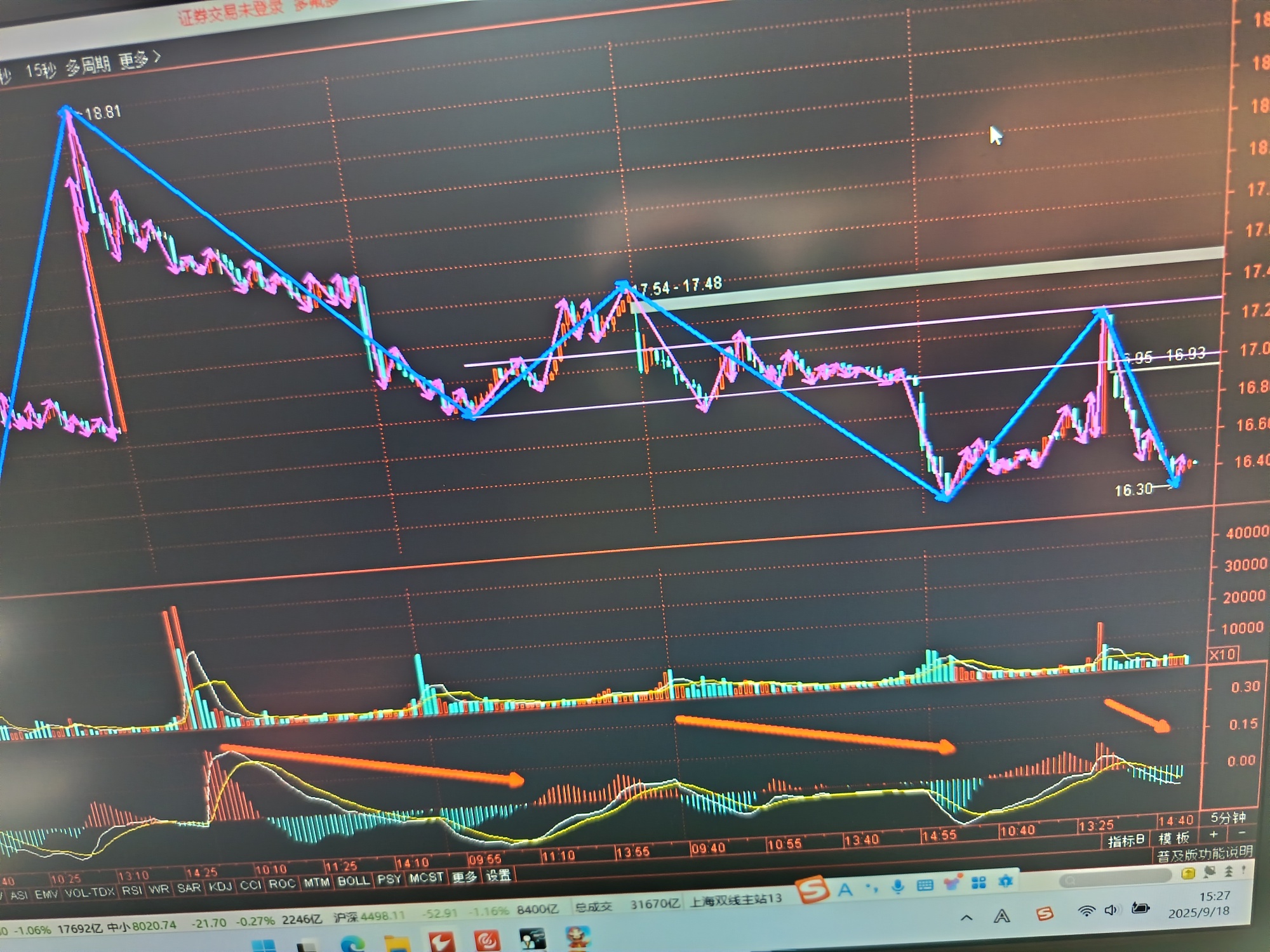 5分钟图。5分钟盘整背驰,中枢区间是 17.01到17.63。不出意外明天最少反弹到中枢区间,看次级别有没有上涨盘整背驰,如果没有,那就反转开始,看能不能破前高。如果没反弹到中枢区间就形成次级别背驰,5分钟就形成三卖了,那就下跌加速了!