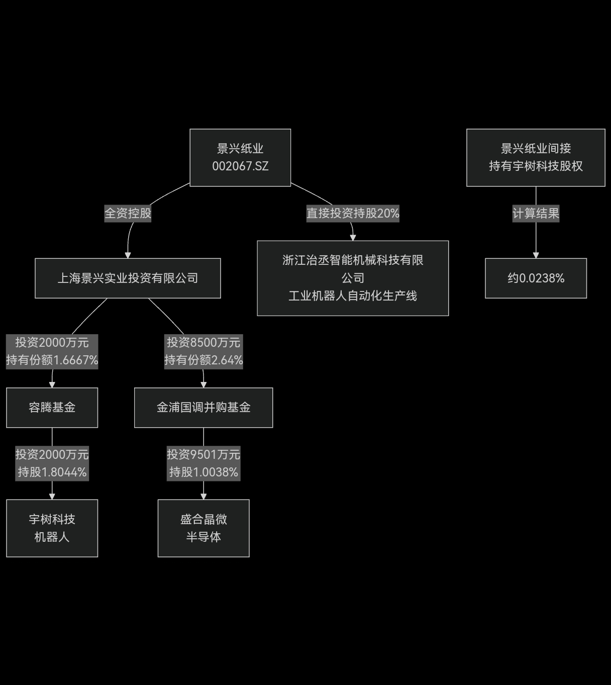 容腾基金对宇树科技的直接投资额为2000万元。这意味着景兴纸业通过基金间接持有了宇树科技的部分股权,尽管具体比例未直接披露,但通过多层投资结构,其间接持股比例相对较小。