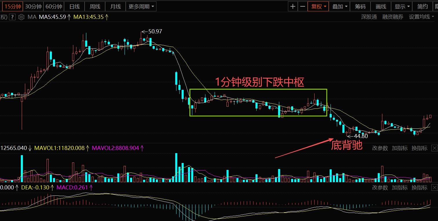 【分类3】反弹无力,继续下跌之后【告别】中枢,甚至回拉不再触碰中枢下沿的低点,这是15分钟级别的卖点。需要降低部分仓位直到出现【日线底分型】这样的止跌信号。