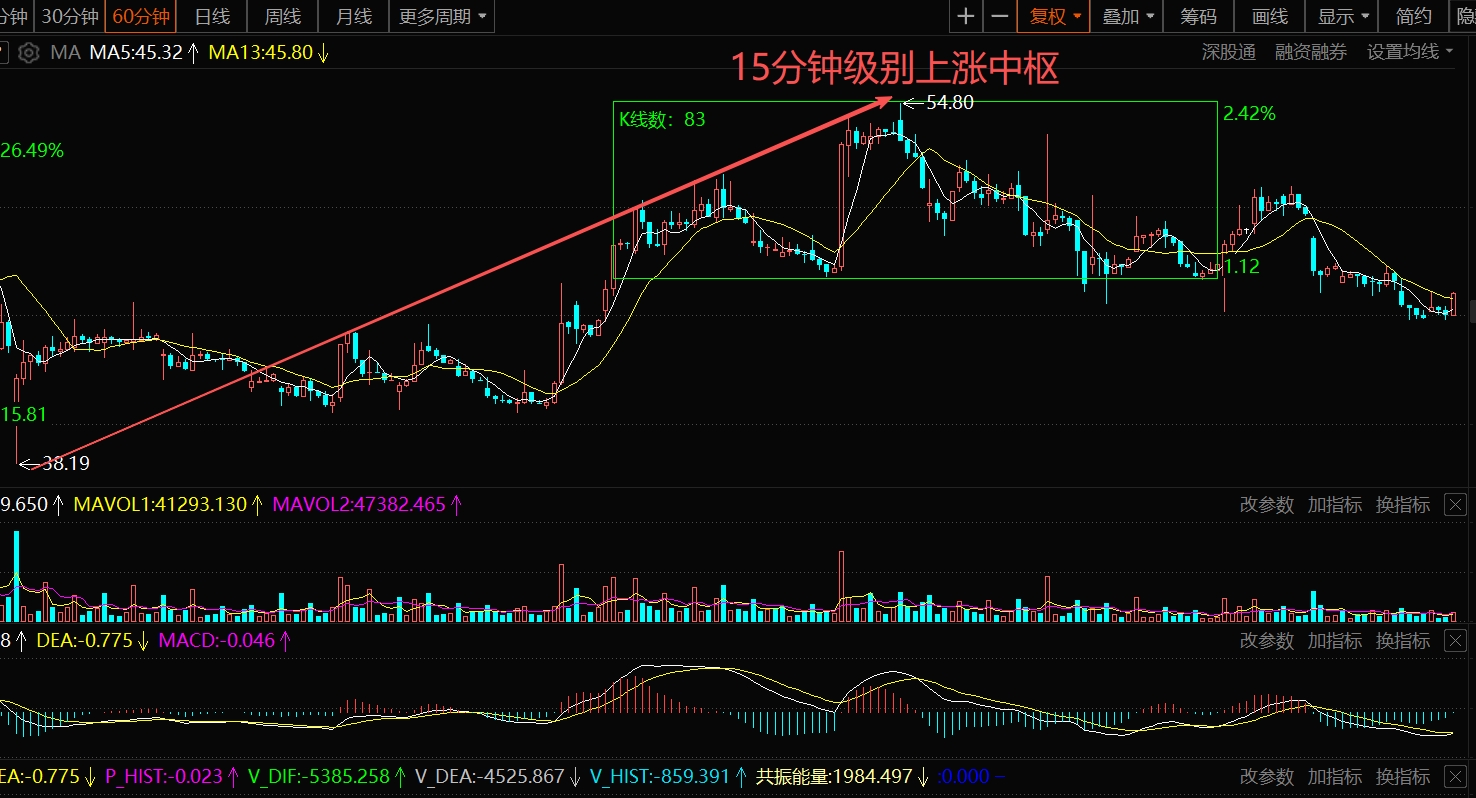 【60分钟级别】:上涨走势未结束,当下处于上涨中枢离开段;