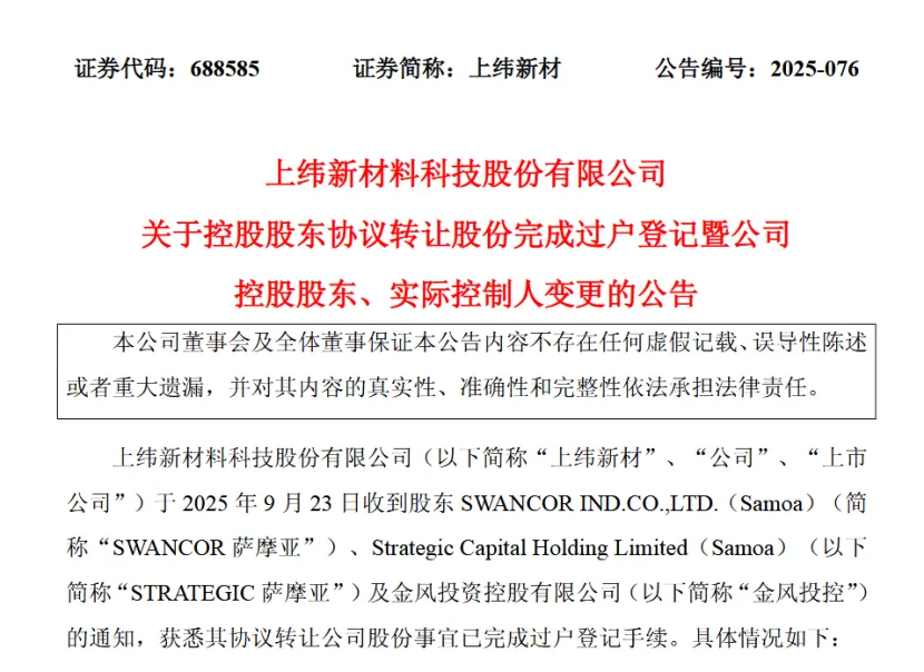 9月23日晚,上纬新材发布公告称,控股股东协议转让股份已完成过户登记,公司控股股东由SWANCOR萨摩亚变更为智元恒岳,智元机器人创始人、董事长邓泰华成为上纬新材实控人。公告同时披露后续将推进部分要约收购计划。