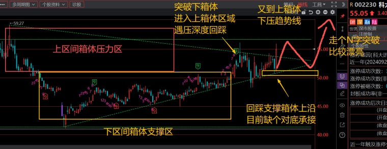 下面箱体是弱势盘整,上面箱体是试压突破。