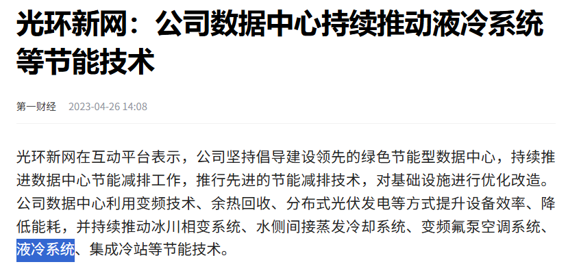 针对超节点最棘手的散热难题,光环新网早于行业布局液冷技术。公司通过绿电、光伏与液冷的多元融合,实现算力资源的低碳可持续运行。