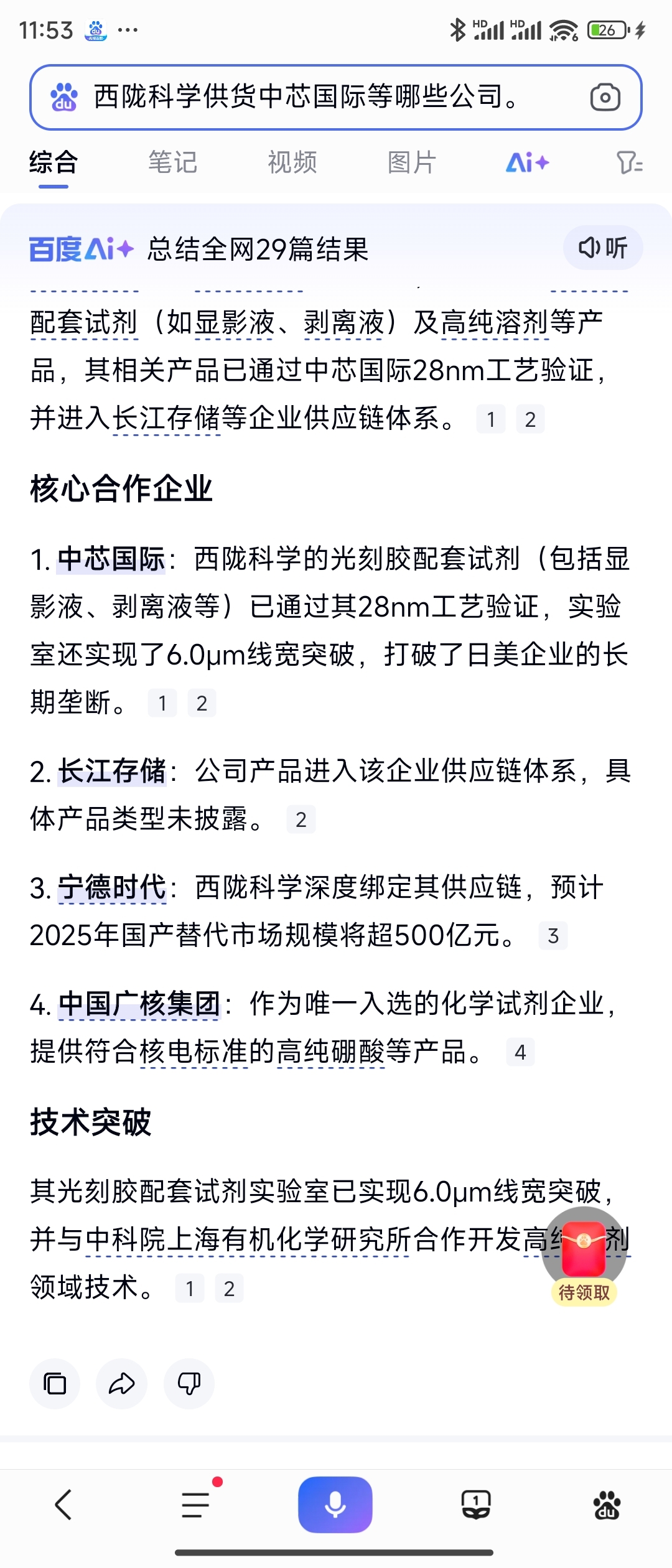 $中芯国际(SH688981)$ 西陇科学作为中芯国际的供货商,主要提供光刻胶配套试剂(如显影液、剥离液)及高纯溶剂等产品,其相关产品已通过中芯国际28nm工艺验证,并进入长江存储等企业供应链体系。 2核心合作企业中芯国际:西陇科学的光刻胶配套试剂(包括显影液、剥离液等)已通过其28nm工艺验证,实验室还实现了6.0μm线宽突破,打破了日美企业的长期垄断。 12长江存储:公司产品进入该企业供应链体系,具体产品类型未披露。 2宁德时代:西陇科学深度绑定其供应链,预计2025年国产替代市场规模将超500亿元。 3中国广核集团:作为唯一入选的化学试剂企业,提供符合核电标准的高纯硼酸等产品。 4技术突破其光刻胶配套试剂实验室已实现6.0μm线宽突破,并与中科院上海有机化学研究所合作开发高纯溶剂领域技术。
